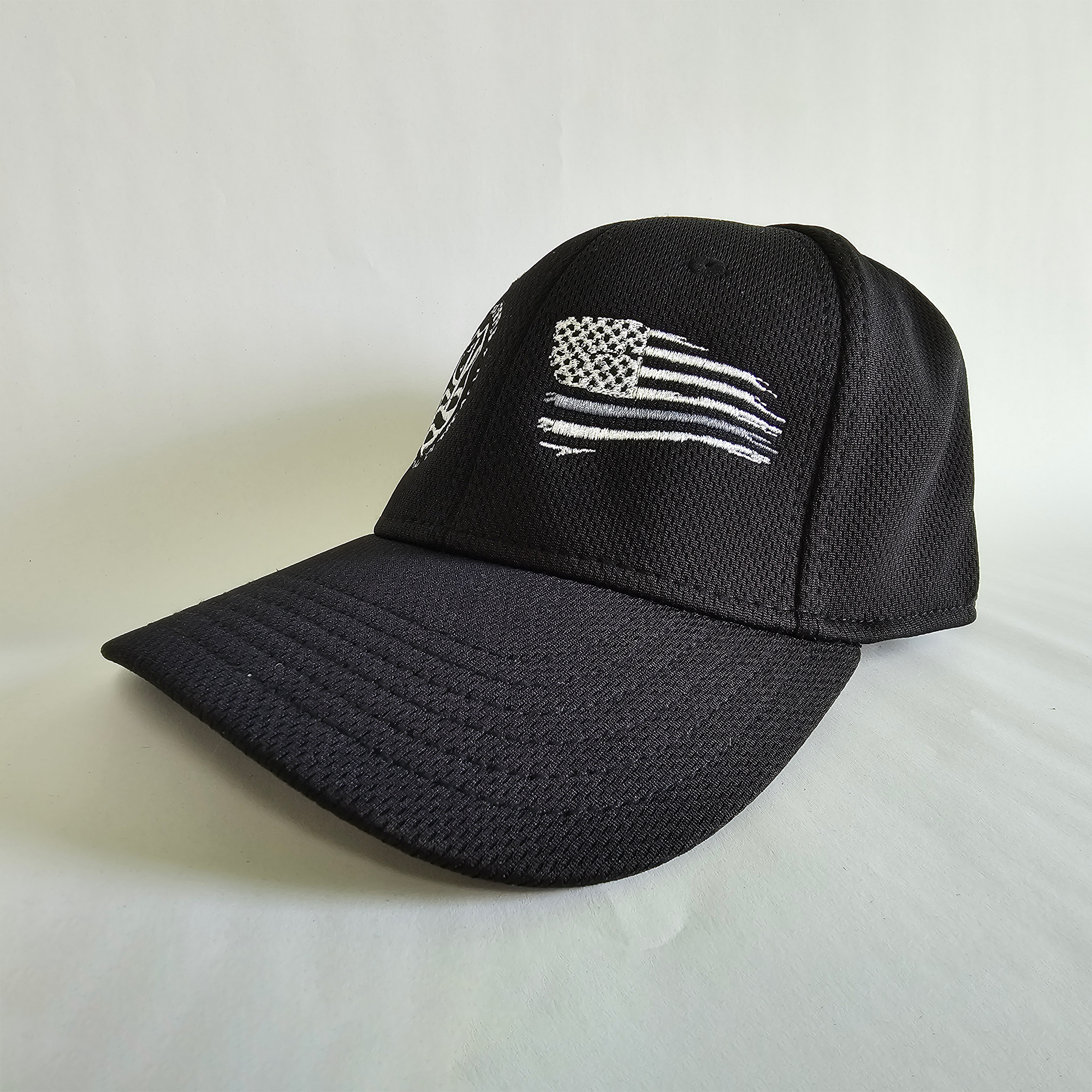 The hats are made of stretchable fabric with adjustable velcro closure, allowing for a larger size range. One hat features the embroidered round Desert Waters logo, and the other the banner logo. Both feature the embroidered Correctional Officer flag.